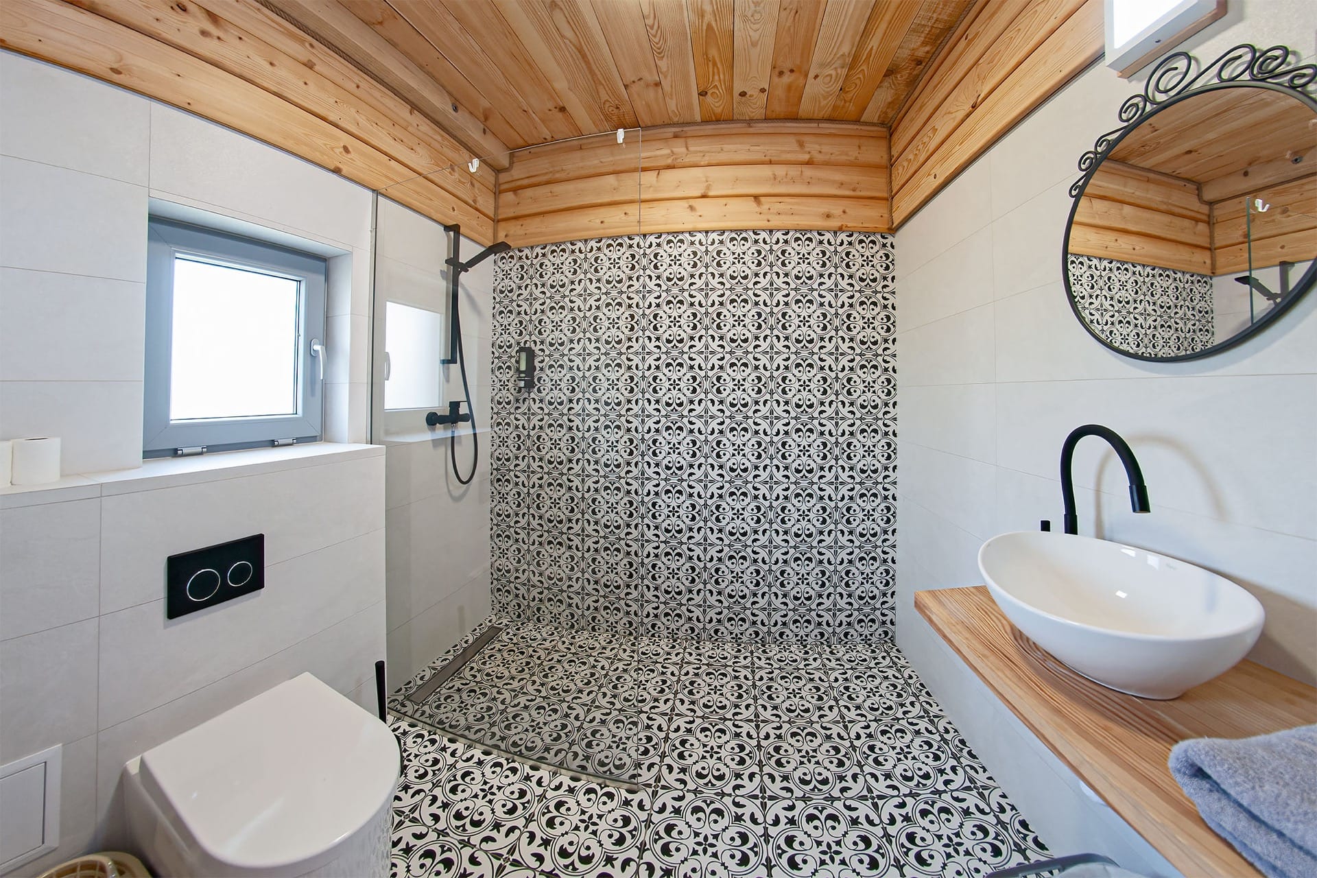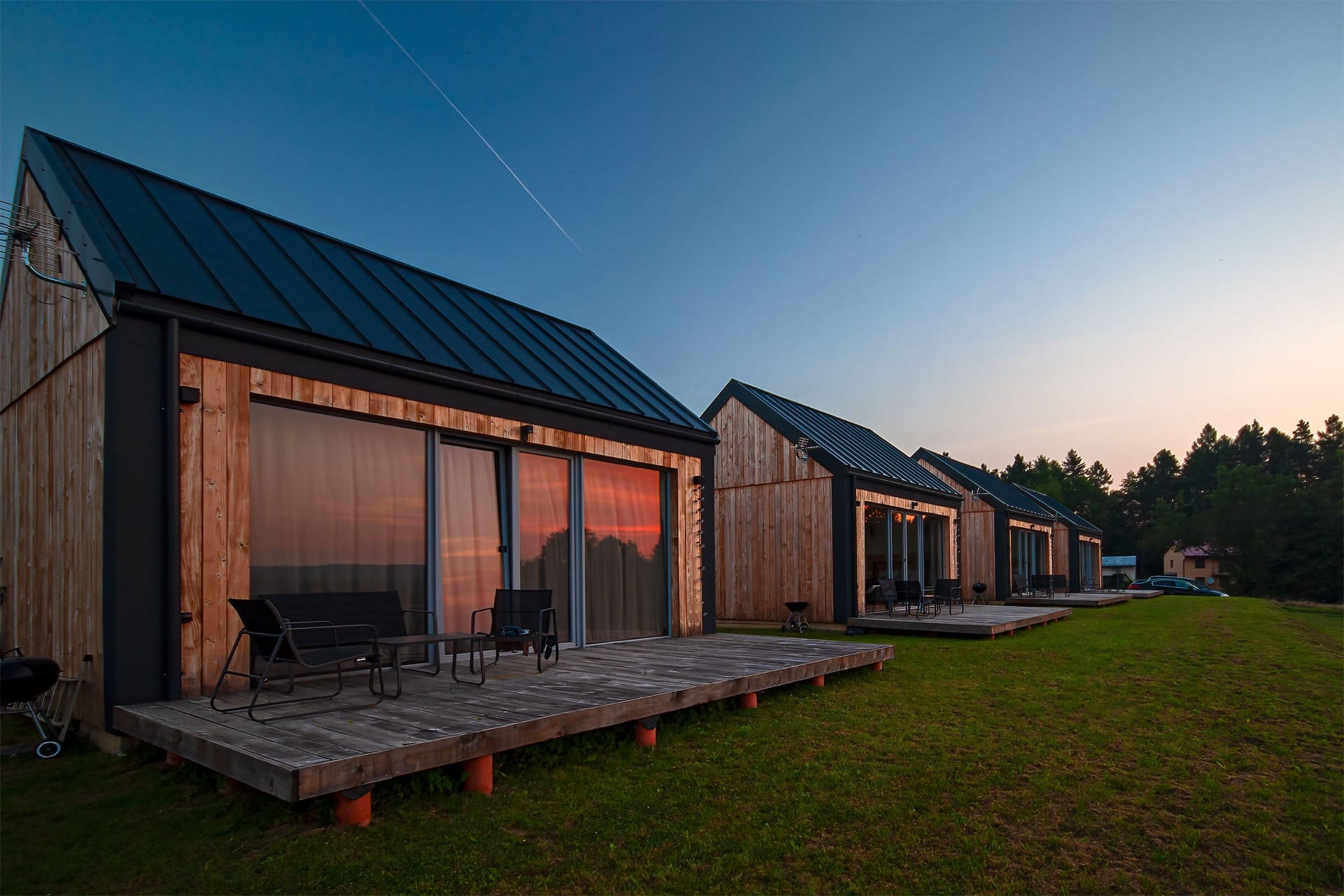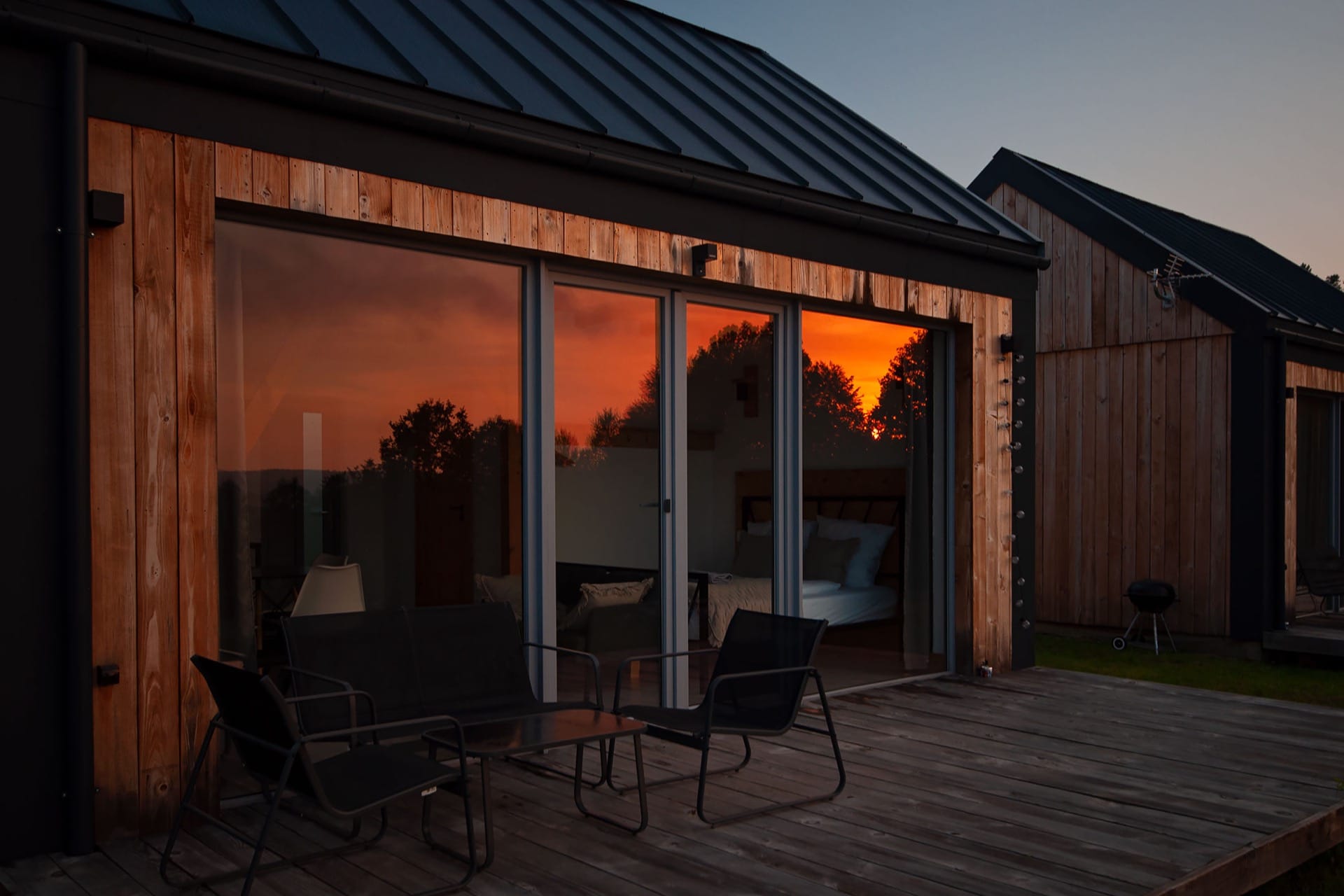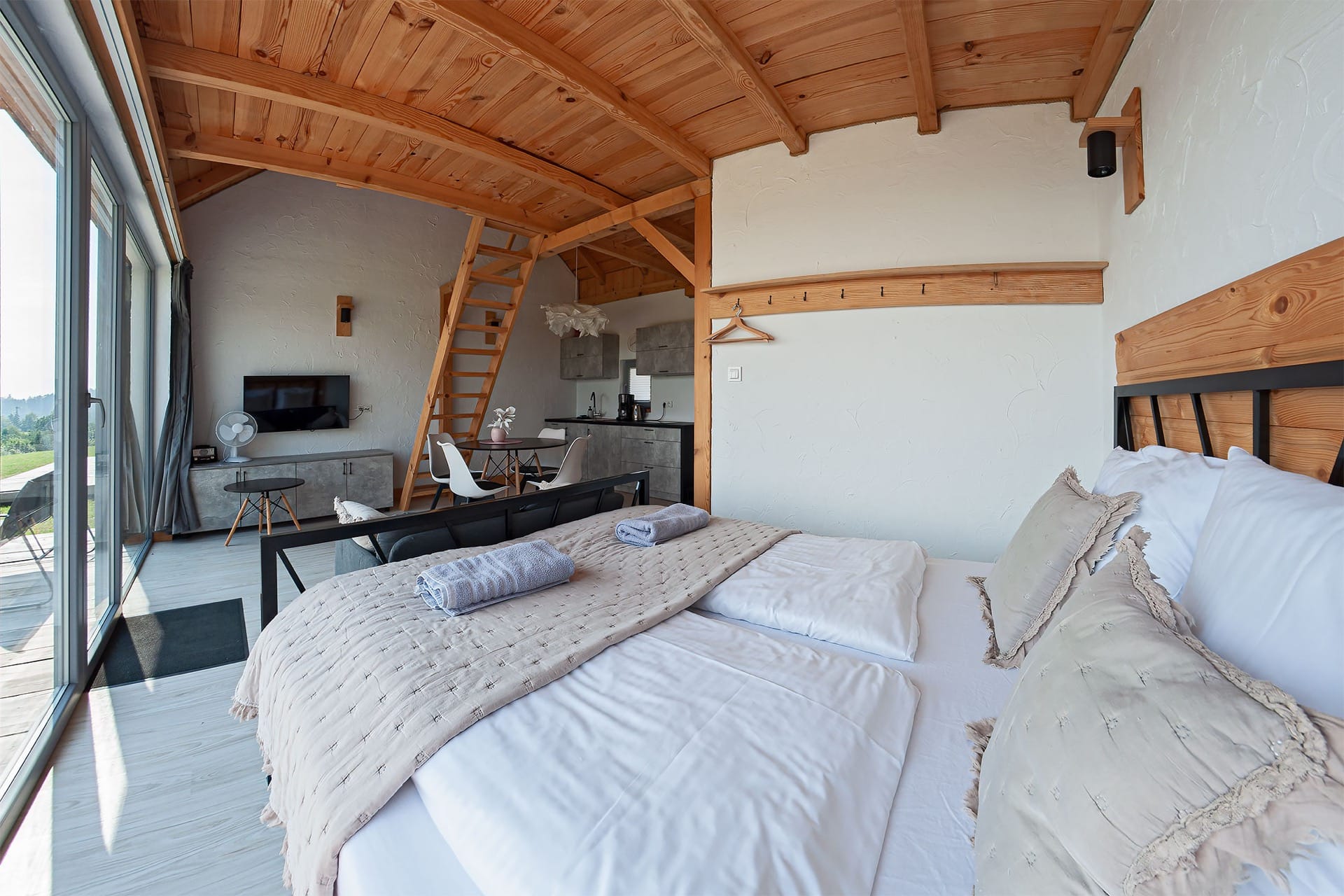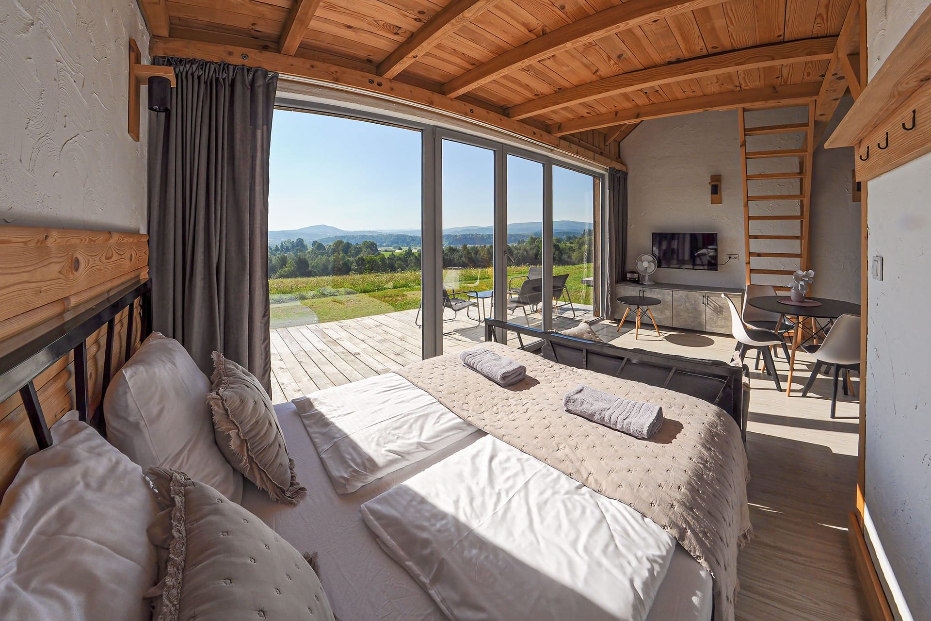 Wnętrza są przestronne, jasne, z dużą ilością naturalnego światła, co potęguje wrażenie bliskości z przyrodą. Dominują naturalne materiały – drewno, kamień i len, co tworzy ciepłą, przytulną atmosferę. Komfortowy design, dbałość o detale i minimalizm sprzyjają wypoczynkowi.